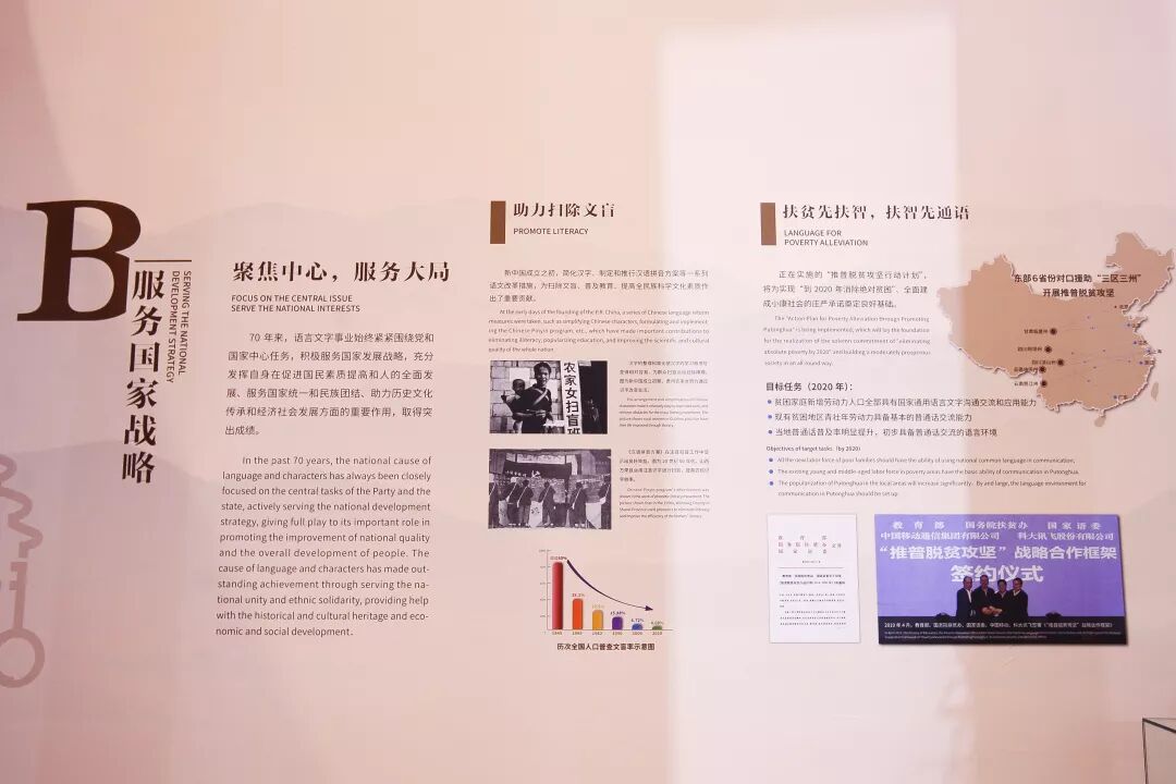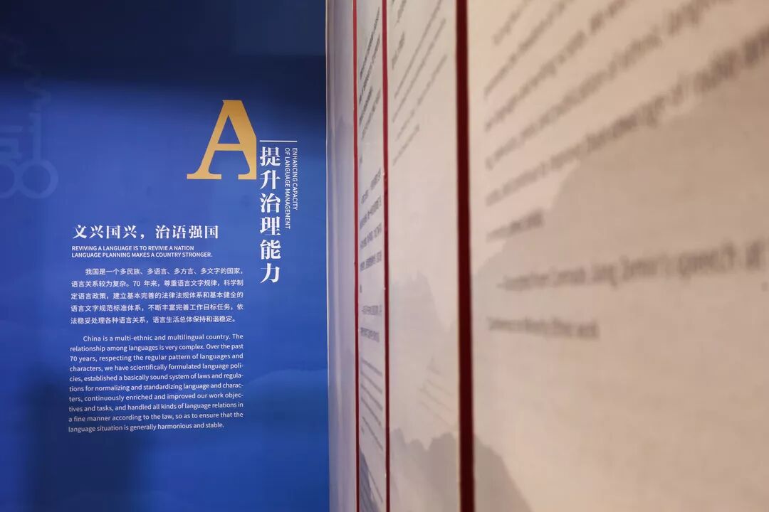 新中国成立七十周年语言文字事业发展成就展从提升治理能力、服务国家战略、增进民生福祉、弘扬中华文化、讲好中国故事等五个部分,系统展示我国语言文字事业取得的辉煌成就,体现了党和国家对语言文字工作的高度重视。