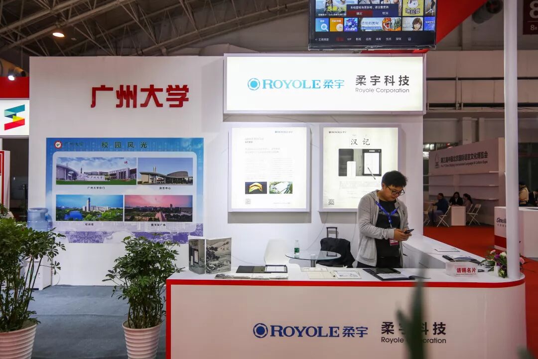 语言企业和机构成果展汇聚了科大讯飞、声望听力、北大方正、商务印书馆、人民教育出版社、北京语言大学语言资源高精尖创新中心、北京师范大学汉字研究与现代应用实验室、首都师范大学文学院、语文出版社、外语教学与研究出版社、华语教学出版社、广州大学、北京印刷学院、天津师范大学、山东师范大学文学院、鲁东大学、广西民族大学、贺州学院、沧州师范学院等著名语言文化机构和企业,充分展示语言科技、文化传播等方面的最新成果。科大讯飞展示了新一代智慧课堂、语言扶贫APP等最新人工智能及智能语音产品,并在主论坛发布“全球中文学习平台”;北京语言大学语言资源高精尖创新中心带来了北京冬奥会语言服务行动计划标志性成果之一“冬奥智能问答机器人”,未来将在冬奥会上大显身手;北大方正“中华精品字库工程”深度融合书法艺术与信息技术;北京印刷学院展示的国庆70周年志愿服务视觉形象设计凸显了学校在设计艺术和语言创意领域的优势实力和社会影响力;广州大学中文经典文化治疗亚健康的技术通过VR实现唐诗宋词植入沉浸式场景,从而干预体验者的心理和行为潜能,吸引了不少参观者;柔宇科技最新产品“汉记”将柔性显示与传感技术应用到对外汉语教学;新译科技展示了依托百亿级优质语料数据,以软、硬件为载体,让智能翻译成为服务于国家“一带一路”的多语传播平台;华文众合展示了智慧书法教室系统,致力于中华民族传统书法文化的传承和发展;声望听力展示了应用世界前沿科技的助听器产品、听力检测设备及高标准、专业化、一站式听力解决方案。